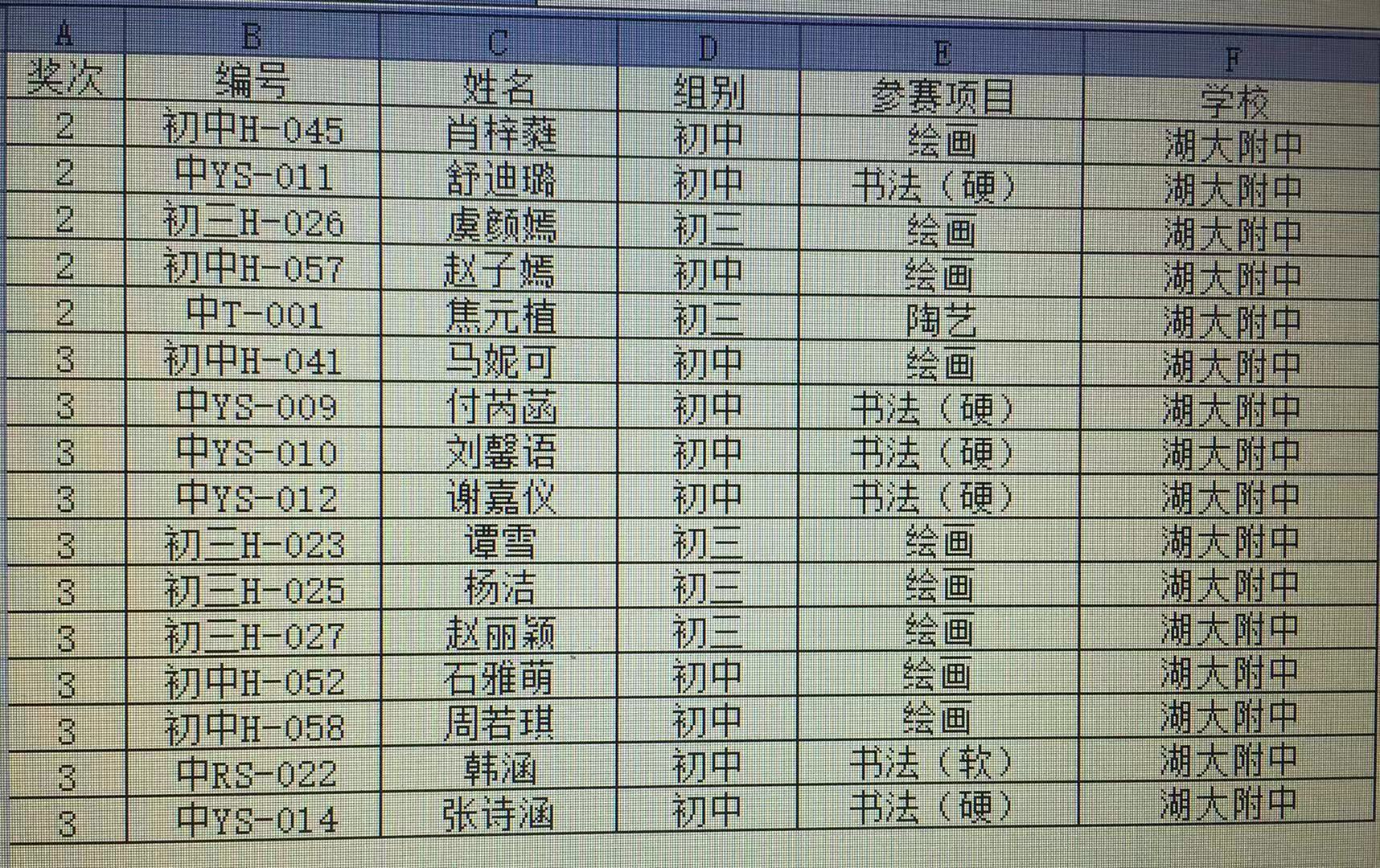 為豐富武昌區(qū)中小學(xué)學(xué)生藝術(shù)文化生活,推進(jìn)武昌區(qū)基礎(chǔ)美術(shù)特色教育特色發(fā)展,選拔參加武漢市“藝術(shù)小人才”美術(shù)比賽優(yōu)秀選手,2019年武昌區(qū)舉辦了優(yōu)秀“藝術(shù)小人才”美術(shù)比賽的活動(dòng)。此次比賽共有 繪畫(huà)創(chuàng)作、陶藝創(chuàng)作、 書(shū)法創(chuàng)作(軟筆或硬筆)三個(gè)大類(lèi)別,比賽分組分為:小學(xué)中年級(jí)組(三、四年級(jí))、小學(xué)高年級(jí)組(五、六年級(jí))、初中組(7、8年級(jí))、初三年級(jí)組、高中組(高一、高二、高三)五類(lèi)別。湖北大學(xué)附屬中學(xué)參賽學(xué)生代表喜獲佳績(jī),現(xiàn)將成績(jī)公布如下。