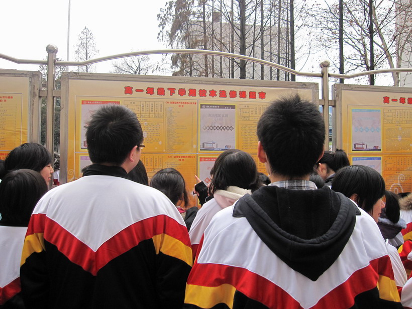3月5日下午,我校高一下學(xué)期選修課超市正式“開張”,本學(xué)期擬開設(shè)20門課程供學(xué)生選擇修習(xí)。20門課程的簡介說明全部布置在操場櫥窗,不僅對課程內(nèi)容進(jìn)行了介紹,明確了修習(xí)要求,還把課程教材的封頁和目錄公布出來,學(xué)生根據(jù)興趣自主選擇。《管理案例分析》《微生物與人類》《氣象觀測與天氣預(yù)報(bào)》《智能機(jī)器人》《京劇欣賞》《健美健身操》《橋牌》等課程成為學(xué)生選擇的熱點(diǎn)課程。
