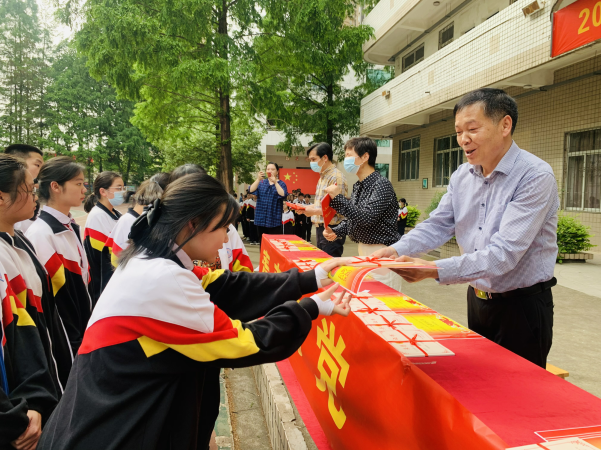 校領(lǐng)導(dǎo)為新團(tuán)員頒發(fā)團(tuán)證、佩戴團(tuán)徽