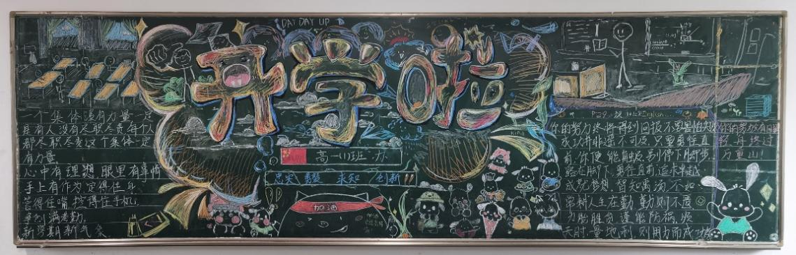 高一(5)班的黑板報上盤旋著一條通紅的“火龍”,同學們新學期元氣滿滿!
