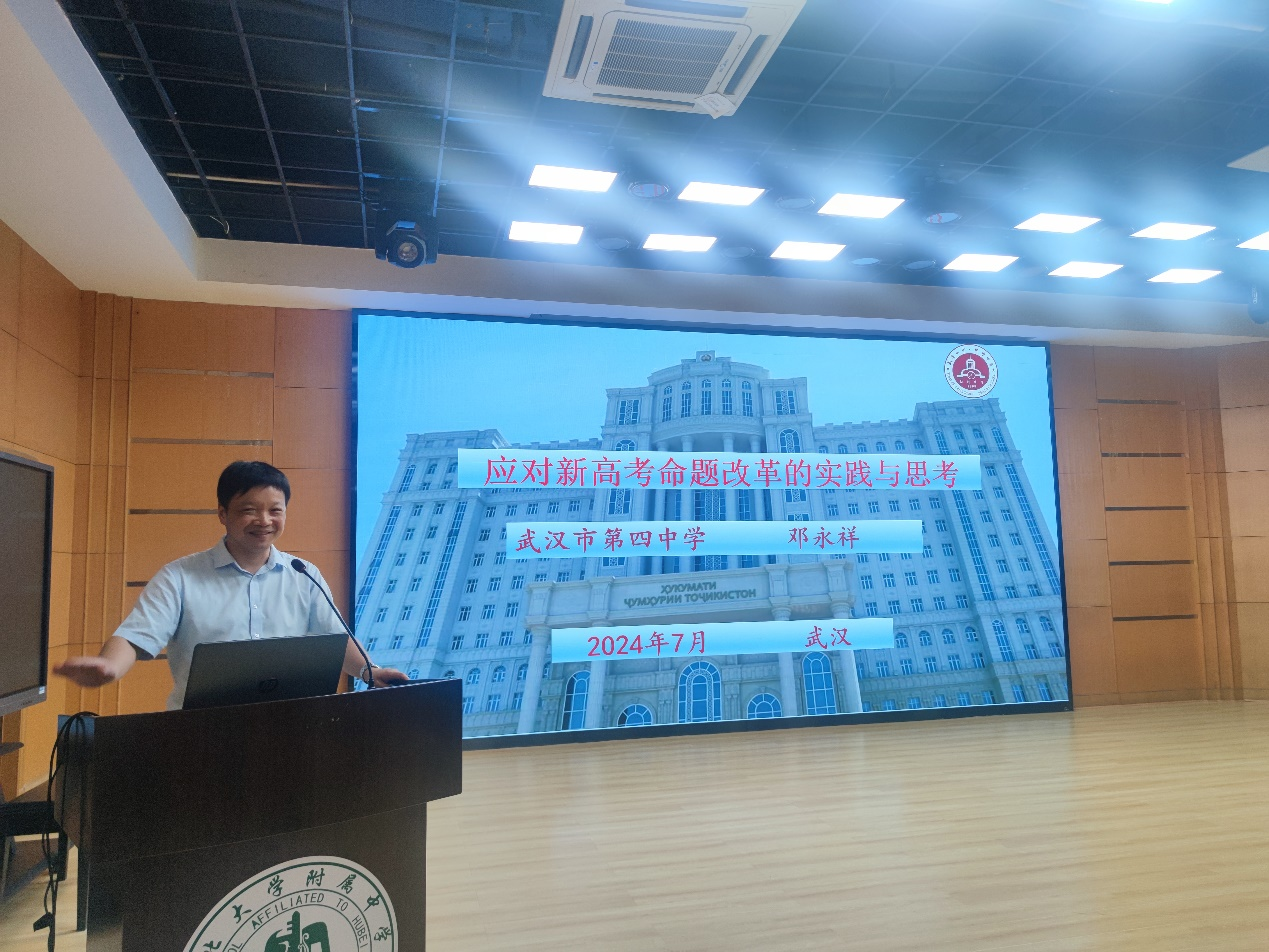 2024年7月9日下午,時(shí)值酷暑,但湖大附中二樓報(bào)告廳卻坐滿了“求知若渴”的老師,他們正在聆聽武漢四中正高級(jí)教師、特級(jí)教師鄧永祥所作的《應(yīng)對(duì)新高考命題改革的思考與實(shí)踐》報(bào)告。