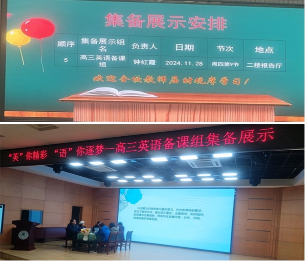 為強(qiáng)化教師之間的協(xié)作與溝通,深入挖掘教學(xué)資源,進(jìn)一步提升教學(xué)質(zhì)量,落實(shí)集體備課展示系列活動(dòng),湖北大學(xué)附屬中學(xué)于11月28日第九節(jié)課在學(xué)校二樓報(bào)告廳進(jìn)行了高三英語備課組的集體備課展示。