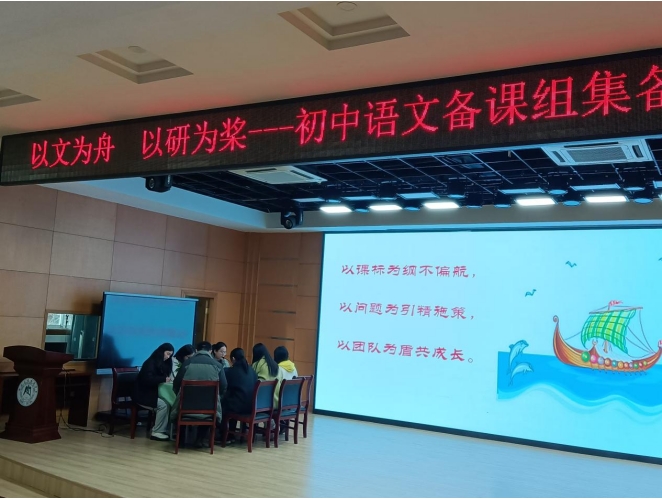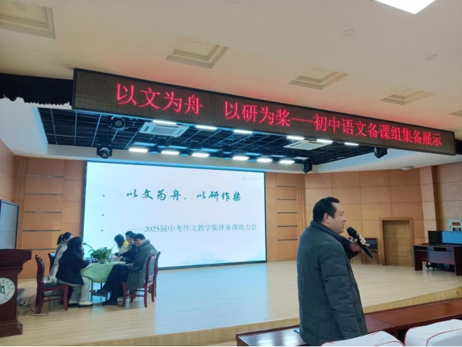 以文為舟,以研作槳,揚(yáng)帆破浪正當(dāng)時(shí)。2025年2月27日下午,初中部語(yǔ)文組于二樓學(xué)術(shù)報(bào)告廳舉辦中考作文教學(xué)集體備課助力會(huì)。百余名教師齊聚一堂,以新課標(biāo)為舵、元調(diào)診斷為帆、團(tuán)隊(duì)智慧為槳,共探中考作文高效教學(xué)路徑,為初三師生精準(zhǔn)備考賦能。