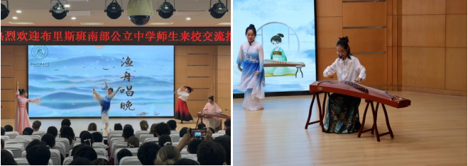 在二樓報告廳,尹凌老師指導的古箏表演《漁舟唱晚》拉開了師生互動的序幕。悠揚的琴聲讓澳大利亞師生沉浸在中國傳統(tǒng)音樂的魅力中。