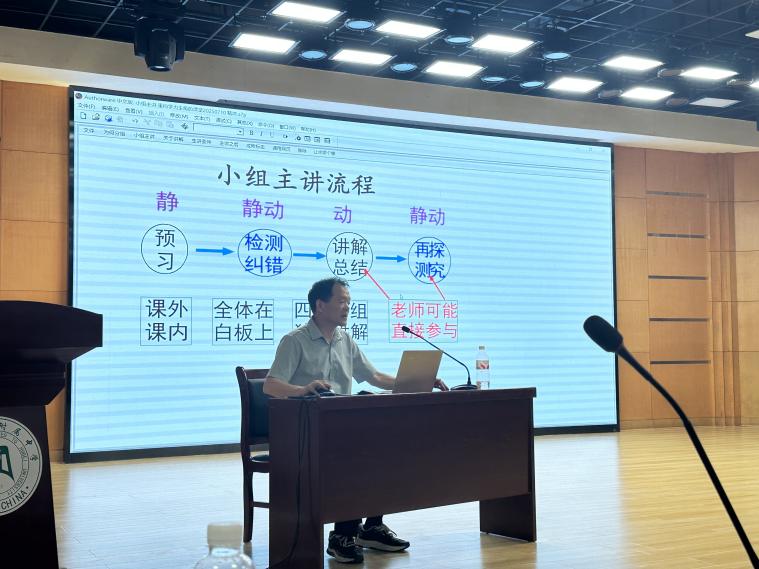 為提高學(xué)生講課質(zhì)量,鄭老師特別強(qiáng)調(diào)老師對(duì)學(xué)生的培訓(xùn)和指導(dǎo)作用。他分享自己的經(jīng)驗(yàn):自己的“小組主講”課堂要求老師先導(dǎo)再教,先苦后甜。至少用一個(gè)學(xué)期教會(huì)學(xué)生當(dāng)“老師”,才能保證教學(xué)質(zhì)量,促進(jìn)每一位學(xué)生的素質(zhì)發(fā)展。一個(gè)學(xué)期系統(tǒng)教授學(xué)生如何講解,將分析、歸納、表達(dá)等能力作為明確的教學(xué)內(nèi)容,從而實(shí)現(xiàn)了學(xué)生從“聽(tīng)懂”到“講清”的深度跨越。