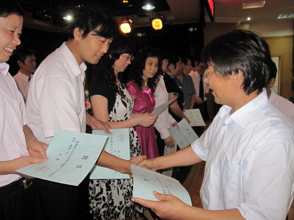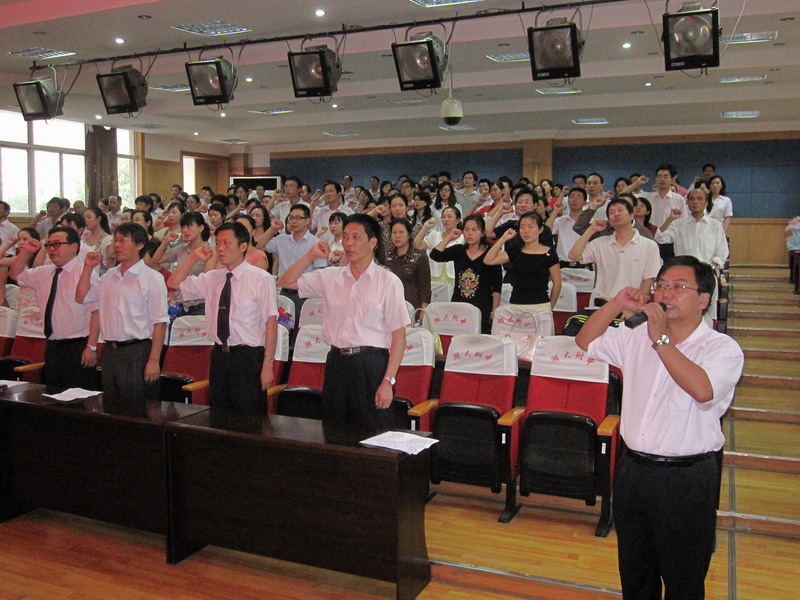 大會在莊嚴的國歌聲中開幕,黨總支書記楊元業(yè)帶領(lǐng)全體教職員工宣誓并主持會議。校長李玉新宣讀表彰決定,并代表學(xué)校黨政工團向受表彰的先進集體和個人表示熱烈的祝賀,向全體教職員工致以節(jié)日的問候。領(lǐng)導(dǎo)班子全體成員為獲獎集體和個人頒發(fā)證書和獎金。接著,副校長朱寧主持了青年教師拜師儀式,并向20余名受聘導(dǎo)師頒發(fā)聘書。