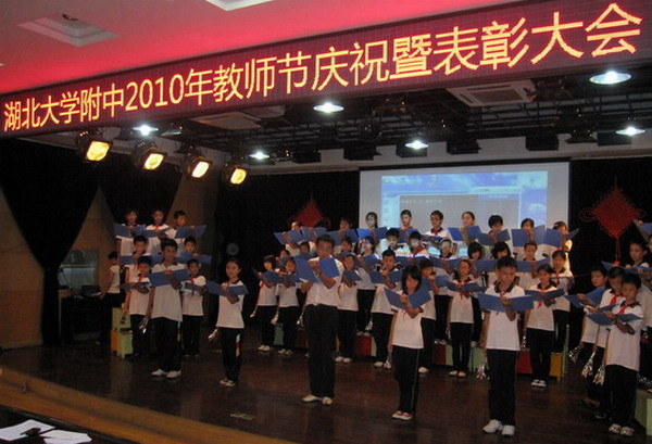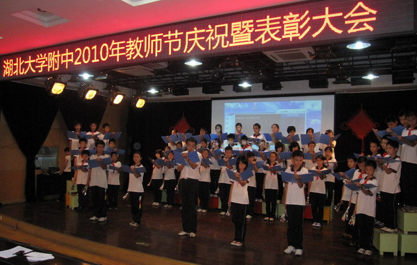 湖北大學(xué)副校長顧豪爽在致辭中指出,附中高水平通過省級示范學(xué)校督導(dǎo)評估,躋身為湖北省綜合辦學(xué)水平示范學(xué)校,不僅使附中的發(fā)展邁上了更高的平臺,也為湖北大學(xué)建設(shè)高水平大學(xué)提供了強有力的支持。在致辭中勉勵教職工要愛崗敬業(yè),熱愛自己的職業(yè);要學(xué)為人師,精通自己的職業(yè);要行為世范,獻身自己的職業(yè)。同時,希望附中站在新的起點上,繼續(xù)銳意進取、不斷創(chuàng)新,全體教職工以更加昂揚的工作斗志、更加飽滿的工作熱情,不斷提升學(xué)校的綜合辦學(xué)水平。