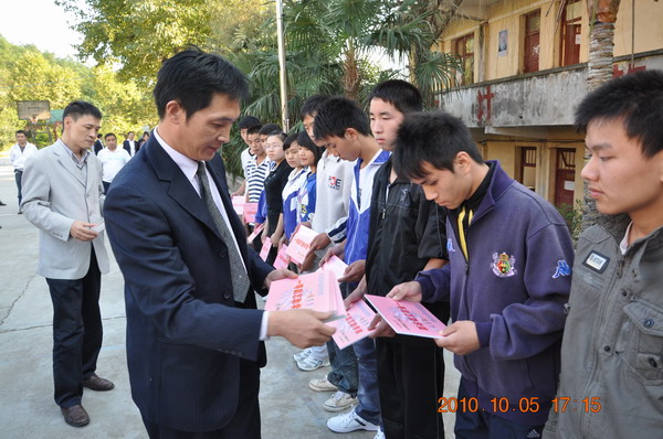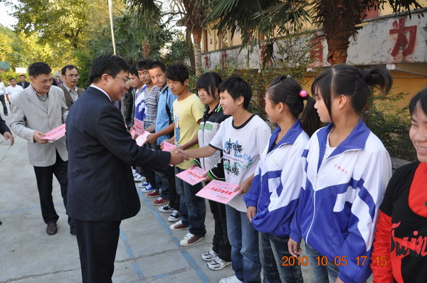 2010年國慶節(jié)休假期間,我校開展中西部地區(qū)教育“手拉手”活動。學校黨總支書記楊元業(yè)、副校長劉朝新帶領(lǐng)7名教師赴貴州賞郎中學開展“送教”活動,在賞郎中學上課、聽課、評課、主持集體備課等,學校為賞郎中學優(yōu)秀學生頒發(fā)勵志獎學金和榮譽證書,并為該,F(xiàn)代教育技術(shù)提供技術(shù)支持。