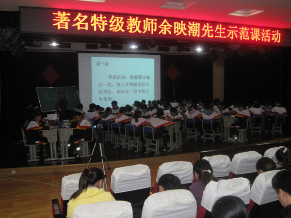 10月14日下午,全國著名語文特級(jí)教師、全國中語會(huì)學(xué)術(shù)委員會(huì)副主任余映潮先生應(yīng)邀來我校講學(xué)。余映潮的《前進(jìn)一步,再前進(jìn)一步》《夸父逐日》兩節(jié)精彩的示范課,實(shí)踐了他獨(dú)創(chuàng)的“板塊式、主問題、詩意手法”閱讀教學(xué)藝術(shù)體系,和“思路明晰單純,提問精粹實(shí)在,品讀細(xì)膩深入,學(xué)生活動(dòng)充分,課堂積累豐富”的教學(xué)設(shè)計(jì)30字訣,讓全校教師共享了一場教學(xué)盛宴。