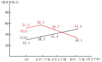 我們?cè)?jīng)就父母親對(duì)孩子的教育影響力發(fā)展情況做過(guò)調(diào)查研究,下面是一幅父母教育影響力的比較圖: