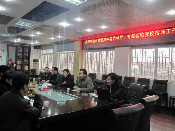 2011年元月18日,武漢水果湖高中課改工作考察小組一行8人在副校長(zhǎng)徐生龍的帶領(lǐng)下,到我校參觀交流。學(xué)校校長(zhǎng)李玉新、副校長(zhǎng)朱寧及其他領(lǐng)導(dǎo)參加了接待交流活動(dòng)。