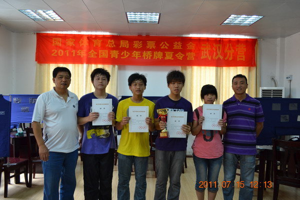 2011年7月 14日-15日,武漢市中學(xué)生橋牌錦標(biāo)賽在鐵四院中學(xué)舉行,來自全市的19支參賽隊(duì),進(jìn)行了2天六輪的瑞士移位賽角逐。代表我校參賽的湖北大學(xué)附中2隊(duì)獲得第一名好成績。