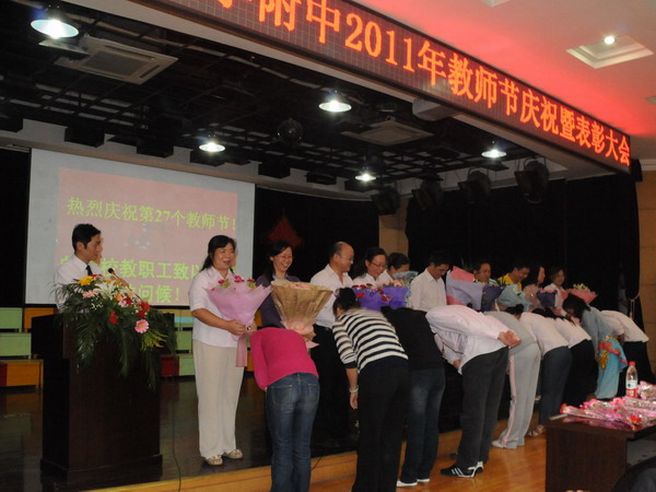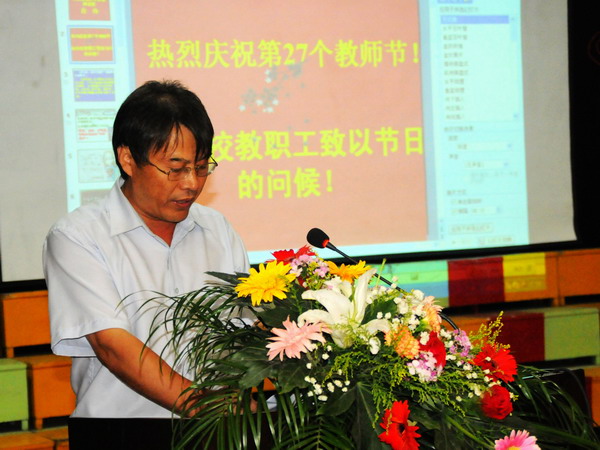 致辭中,顧校長首先對附中全體教職工致以崇高的敬意和節(jié)日的問候。然后對附中在過去的一年里所取得的成績表示祝賀,對團結努力無私奉獻的附中老師們表示感謝。他欣喜地看到隨著附中邁入了省級示范學校的行列,學校辦學實力增強、影響力擴大,實現(xiàn)了良好的發(fā)展態(tài)勢。他指出教師是學校發(fā)展的關鍵,他勉勵教職工們應“愛崗位、愛讀書、愛學生”,以高尚師德、人格魅力、學識風范教育感染學生,做學生健康成長的指導者和引路人。他希望全校教職工繼續(xù)齊心協(xié)力開拓創(chuàng)新,以優(yōu)異的成績?yōu)楹贝髮W八十華誕獻禮。他熱情洋溢的講話獲得了大家陣陣熱烈的掌聲。