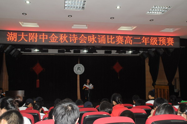 下午四點(diǎn),湖大附中2011年文化節(jié)高二年級(jí)金秋詩會(huì)正式開始。比賽有條不紊地進(jìn)行,27名選手都竭盡所能,感情飽滿,展現(xiàn)出自己的風(fēng)采。經(jīng)過一個(gè)半小時(shí)的激烈角逐,經(jīng)評(píng)委評(píng)定,語文老師謝常玲以及學(xué)生會(huì)干部監(jiān)督審核后,高二(7)班何琪等五位選手獲得一等獎(jiǎng)。