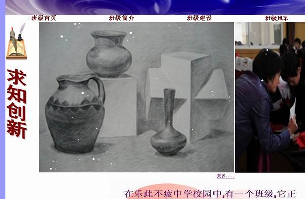 6、班級風采:要有班級成員優(yōu)秀作品展示,能夠代表學校和班級的作品水平,作品要具備代表性,數(shù)量要豐富,學生參與率最好達到100%(作文、繪畫、素描、攝影、健美操展示、舞蹈展示等等)