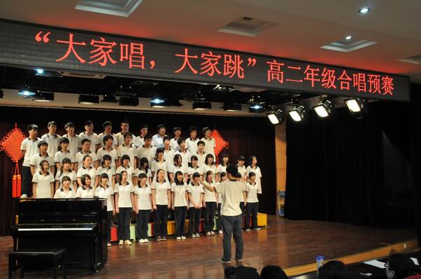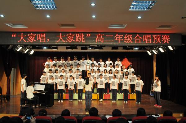 4月25日下午活動課時間,二樓報告廳燈火輝煌、歌聲悠揚、掌聲陣陣,高二年級在此進行了“大家唱、大家跳”活動的合唱預(yù)賽。