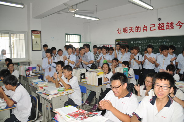 7月26日下午,在韓國(guó)平澤大學(xué)國(guó)際教育院院長(zhǎng)、韓中教育文化研究所所長(zhǎng)樸起徹,蔚山工業(yè)高級(jí)中學(xué)校長(zhǎng)全相浩,蔚山教育廳官員趙英祿的帶領(lǐng)下,韓國(guó)蔚山教育考察團(tuán)師生一行46人來(lái)到了湖北大學(xué)附屬中學(xué)參觀考察。參觀完校園后,考察團(tuán)師生走進(jìn)高三(1)班教室,在老師的帶領(lǐng)下韓國(guó)同學(xué)用中文表達(dá)了對(duì)大家的問候和對(duì)中國(guó)的喜愛,高三(1)班的同學(xué)們以熱烈的掌聲表示了對(duì)韓國(guó)學(xué)生的歡迎。中韓兩國(guó)同學(xué)互動(dòng)交流、融洽溝通,在歡聲笑語(yǔ)之中建立起跨越國(guó)界的友誼。
