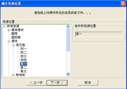 第五步:確定資源位置。在“確定資源位置”對(duì)話框中選擇你上傳的課件所要放的位置。例如:《白楊禮贊》這篇是高中的課文,課件就上傳到“課件”——“語(yǔ)文組”——“高一”,如圖7所示,