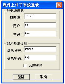 第二步:登錄課件上傳系統(tǒng)。打開(kāi)課件上傳程序時(shí),屏幕會(huì)彈出“課件上傳子系統(tǒng)登錄”的對(duì)話框,要求在“教師登錄信息”組合框中輸入登錄名字和密碼(“數(shù)據(jù)源信息”不用改動(dòng),否則無(wú)法登錄),輸入教師登錄名字和密碼(登錄名字和密碼見(jiàn)下表),單擊“登錄”按鈕,如圖2所示。