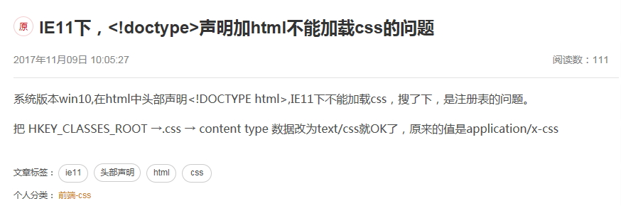 平時(shí)開(kāi)發(fā)網(wǎng)站的時(shí)間很少,又是業(yè)余水平,為了精簡(jiǎn)代碼,就去掉了這行聲明。但在搜索過(guò)程中,了解到<!DOCTYPE html>的作用及意義,于是決定按標(biāo)準(zhǔn)去做。這次在DW8中做了一個(gè)簡(jiǎn)單的html文檔,并在該文檔中添加了簡(jiǎn)單的css,在本地測(cè)試,css起作用,將css放到外部鏈接文檔中,再次測(cè)試,css不起作用。IE11中按F12調(diào)試,css根本沒(méi)加載,谷歌瀏覽器中也是沒(méi)加載。于是又各種搜索,終于找到這篇博客: