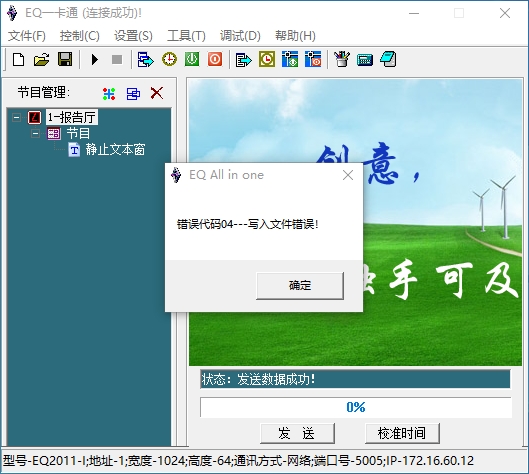 在節(jié)目管理中,新建節(jié)目,新建靜止文本窗,輸入文字,并調(diào)整寬、高度,設(shè)置字體及大小,點擊發(fā)送,出現(xiàn)【錯誤代碼04——寫入文件錯誤】的提示: