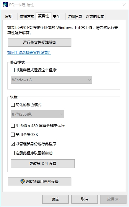 方法2:右鍵點EQ一卡通——屬性——切換到“兼容性”標簽——勾選“以管理員身份運行此程序”——確定。以后雙擊運行軟件即可。推薦該方法。