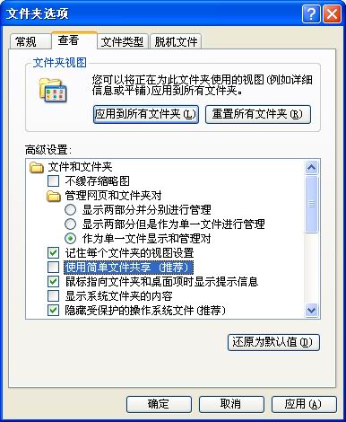 要恢復顯示這個“安全”選項卡,我們可以在資源管理器里單擊“工具”菜單,選擇“文件夾選項”,然后單擊“查看”選項卡,在“文件和文件夾”列表里,把“使用簡單的文件共享”前的勾去掉就可以了。